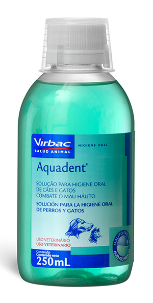 A Solução Virbac para Higiene Oral Aquadent é refrescante e palatável que deve ser adicionada à água de bebida de cães e gatos para controle do mau hálito.