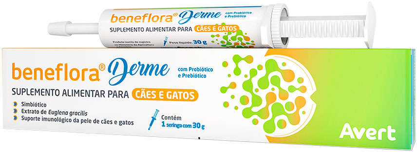 O Suplemento Alimentar Avert Beneflora Derme para Cães e Gatos é um suplemento alimentar inovador, especialmente formulado para o suporte imunológico da pele de pets. Composto por extrato de Euglena gracilis, este produto é ideal para promover a saúde da pele e do pelo dos nossos amigos de quatro patas. Além disso, sua fórmula contém probióticos que ajudam a equilibrar a microbiota intestinal, contribuindo para o bem-estar geral do seu pet.