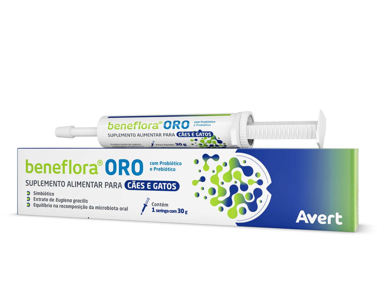 Beneflora Oro Avert é um suplemento alimentar simbiótico desenvolvido para cães e gatos em todas as fases da vida. Sua fórmula combina probiótico, prebiótico e extrato de Euglena gracilis, oferecendo suporte à saúde oral e intestinal de forma integrada.