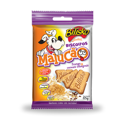 O Bilisko Biscoito Malucão Frango e Cereais para Cães , é produzido com farinhas e cereais integrais, contém prebióticos e extrato de Yucca que favorecem o desenvolvimento da flora intestinal.