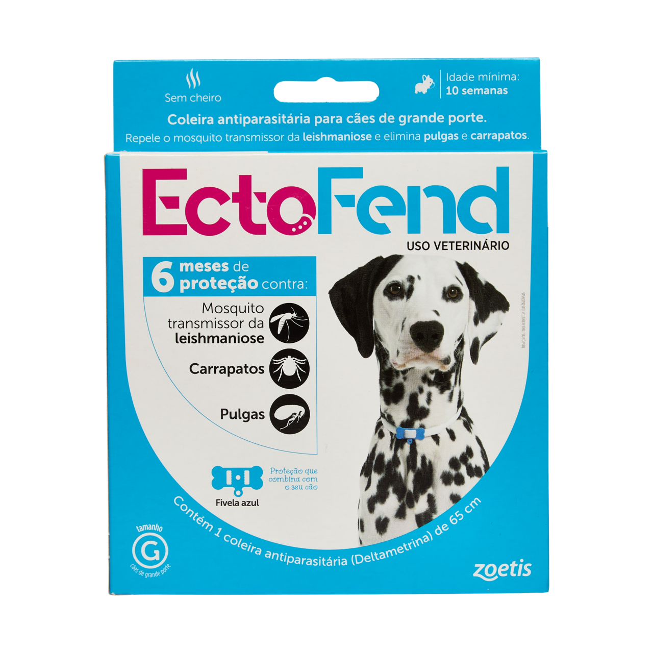 A Coleira Ectofend Azul é a escolha ideal para quem deseja proteger cães de raças grandes com segurança, praticidade e carinho. Desenvolvida pela Zoetis, líder global em saúde animal, é indicada inclusive para a prevenção da leishmaniose, de acordo com as recomendações da OMS e do Ministério da Saúde, graças à sua formulação com deltametrina a 4%.