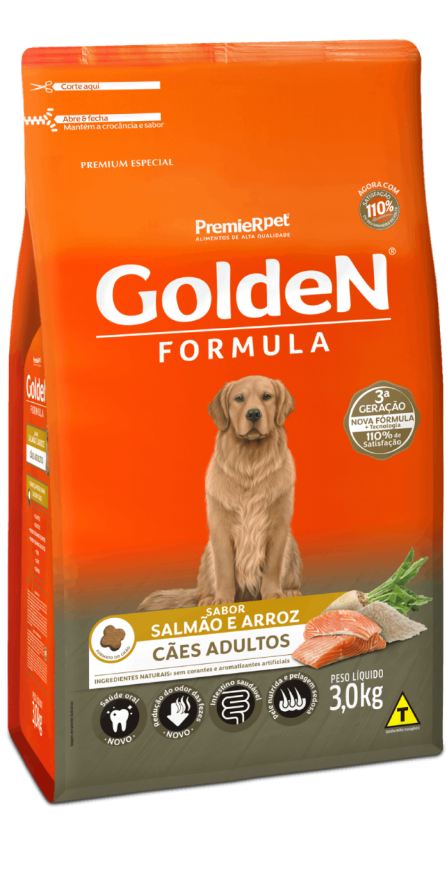 Golden Formula Adultos Salmão & Arroz é um alimento Premium Especial desenvolvido para cães adultos exigentes. Os cães são essencialmente carnívoros e digerem muito melhor alimentos de origem animal. Golden Formula Adultos Salmão & Arroz é um produto completo e visa, acima de tudo, proporcionar aos cães o nível ideal de todos os nutrientes que eles necessitam para uma vida longa e saudável.