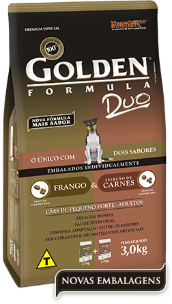 Golden DUO é um alimento com 2 sabores exclusivos, desenvolvidos especialmente para agradar ainda mais o paladar do seu cão. Por entender que o momento das refeições propicia um estreitamento dos laços entre o proprietário e o seu cão, é que mais uma vez a PremieRpet® inova e tem o orgulho de apresentar Golden Formula Duo Cães Adultos Pequeno Porte Frango & Carne. Unindo alta tecnologia, ingredientes diferenciados e sabores naturalmente marcantes, Golden Duo é o primeiro alimento formulado para oferecer ao paladar dos cães uma experiência surpreendente! São dois sabores exclusivos, embalados individualmente, que podem ser alternados conforme desejado. Toda essa liberdade de escolha só é possível pela alta qualidade e segurança digestiva garantidas pelo produto, que permite a variação entre os dois sabores sem a necessidade de período prévio de adaptação. Mais uma conveniência e cuidados oferecidos para satisfazer plenamente as necessidades dos cães.