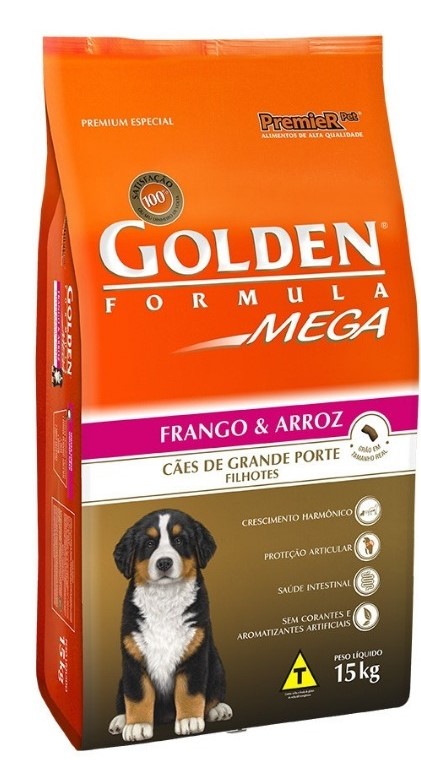 Golden Mega Filhotes é um alimento Premium Especial desenvolvido pela PremieRpet® para filhotes de raças grandes e gigantes que atingem 30 kg ou mais quando adultos. Esses cães apresentam um crescimento acelerado e só terminam seu desenvolvimento por volta de um ano e meio de idade. Nesta fase, qualquer deficiência ou excesso de nutrientes e energia pode trazer consequências sérias, como alterações osteo-articulares. Além disso, os cães de raças grandes e gigantes apresentam fezes volumosas, pois possuem o aparelho digestivo curto, quando comparados aos de raças pequenas.