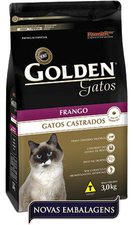 Procedimento cada vez mais recomendado pelos médicos veterinários, a castração promove inúmeros benefícios, mas também alterações fisiológicas que exigem alguns cuidados extras com a dieta do seu gato. Especialmente formulada para atender às necessidades dos gatos castrados, Golden Gatos Castrados Frango auxilia na prevenção da obesidade e no cuidado com o trato urinário, garantindo uma nutrição ótima e saudável.