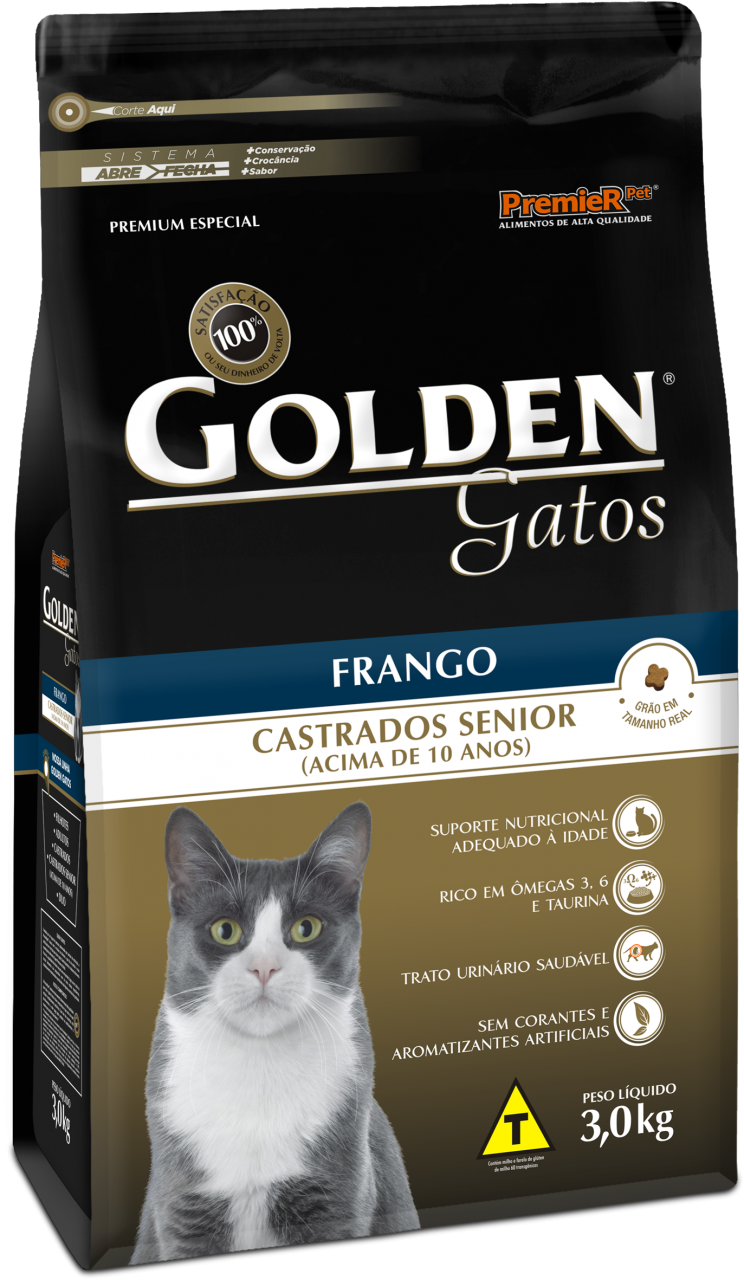 Golden Gatos Castrados Senior foi especialmente formulada para atender às necessidades dos gatos castrados a partir de 10 anos de idade. Oferece um suporte nutricional adequado à idade, através de um balanço de nutrientes ajustado ao gato sênior. Por ser rico em ômegas 3 e 6 e taurina, auxilia nos cuidados com a pele, pelagem, coração e visão. Promove ainda o cuidado com o trato urinário, garantindo uma nutrição ótima e saudável para esta fase da vida do animal.