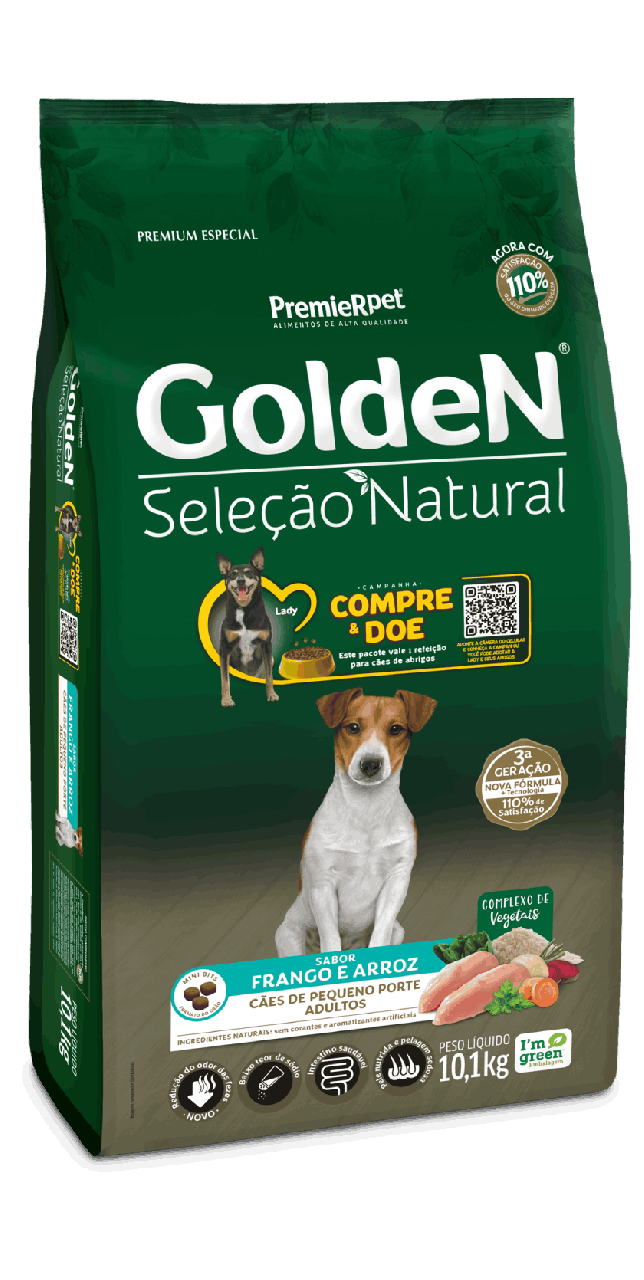 Atenta às tendências do mercado e exigências dos nossos clientes, a PremieRpet® lançou a nova linha Golden Seleção Natural, um alimento Premium Especial que mantém a reconhecida qualidade da Família Golden. Uma linha completa de produtos criada a partir da rigorosa seleção e controle de matéria-prima e formulada com ingredientes exclusivos. Contém complexo de 6 vegetais, como fonte de fibras e sais minerais, baixo teor de sódio para ressaltar o sabor natural dos ingredientes, sem corantes e aromatizantes artificiais e sem ingredientes transgênicos, a linha Golden Seleção Natural é a melhor escolha para que seu pet tenha uma alimentação de acordo com seu estilo de vida. Golden Seleção Natural, saudável como seu estilo de vida.