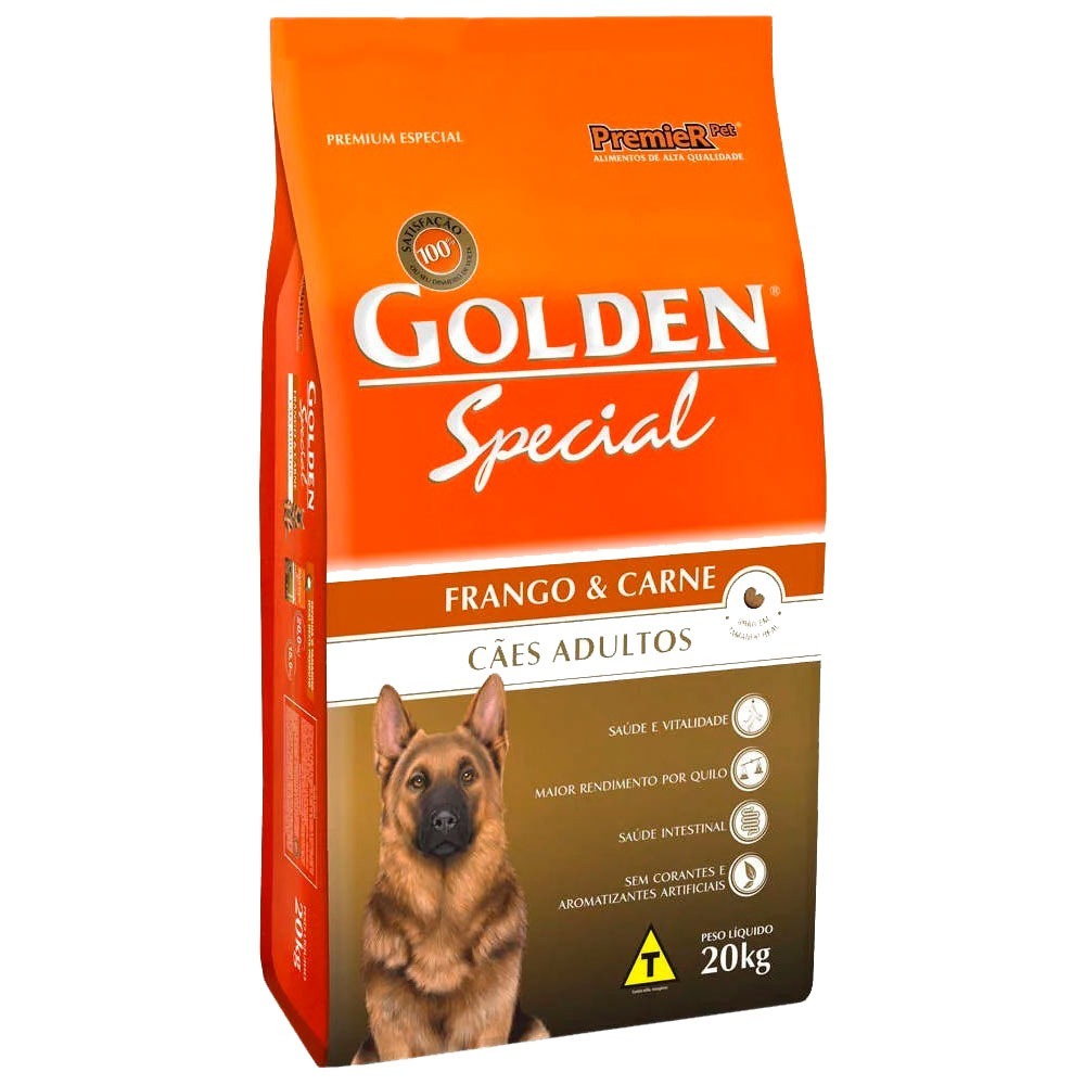 Golden Special Cães Adultos Frango e Carne é um alimento Premium Especial formulado a partir dos mais modernos conceitos em nutrição. Golden Special Cães Adultos é um alimento completo e balanceado que proporciona aos cães adultos o nível ideal de todos os ingredientes que eles necessitam para uma vida longa e saudável. Golden Special utiliza somente proteína de origem animal, para cães mais fortes e saudáveis, sendo indicado para cães adultos de todas as raças.