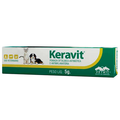 A Pomada Oftalmológica Keravit Vetnil é uma pomada oftálmica à base de gentamicina e hidrocortisona, indicada para o tratamento dos mais diversos processos inflamatórios, infecciosos ou irritações, causadas por bactérias ou fungos ao globo ocular do seu pet.