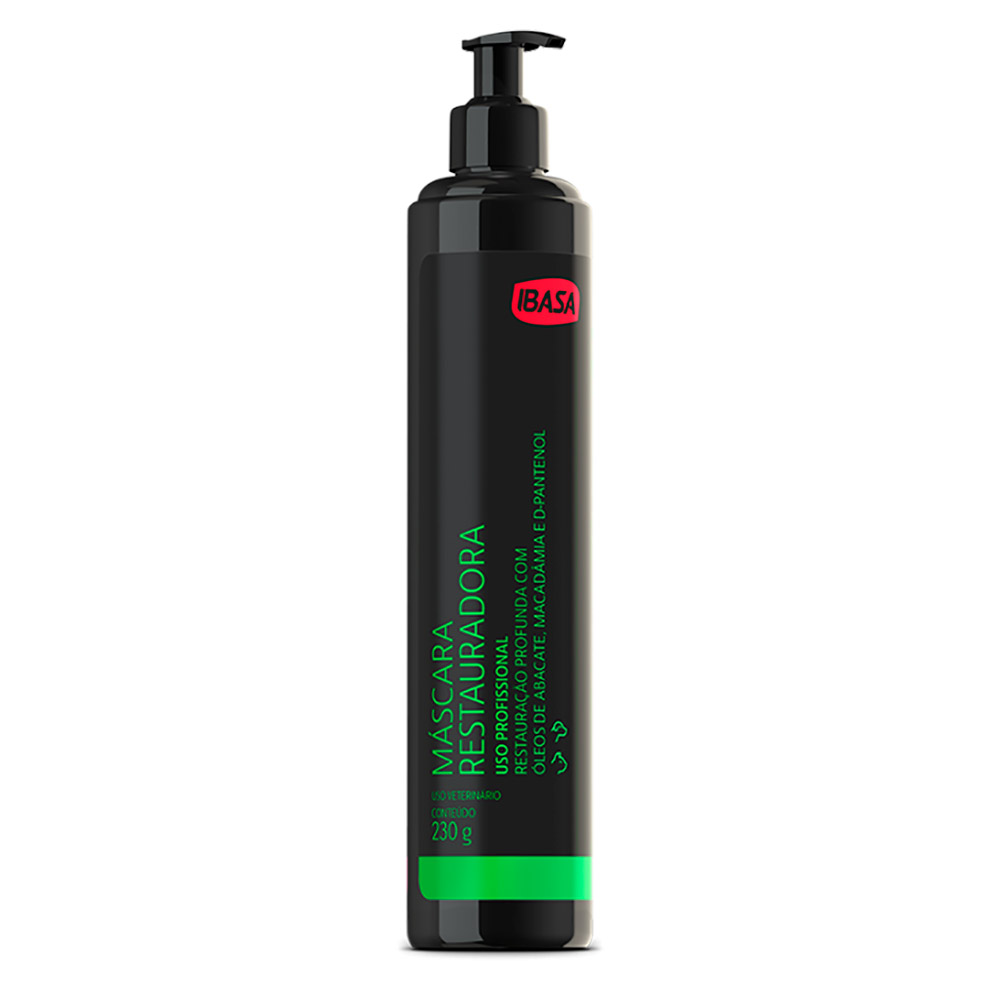 A Máscara Restauradora IBASA é ideal para a recuperação da pelagem danificada. Contém D-Pantenol, que promove uma hidratação profunda e restaura o aspecto saudável da pelagem deixando-a macia, leve e brilhosa. Os óleos de abacate, macadâmia e as proteínas do trigo auxiliam na hidratação, e um silicone especial aumenta o brilho e confere condicionamento imediato