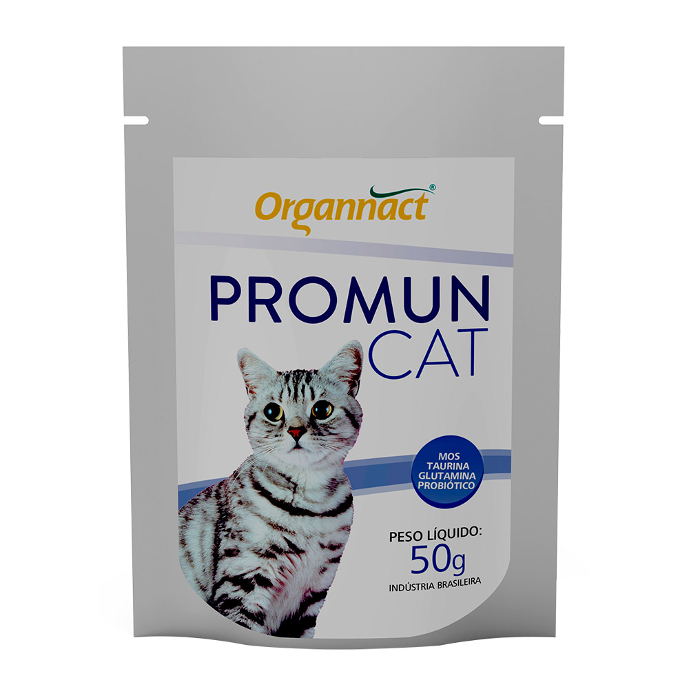 PROMUN CAT é um suplemento vitamínico (A, E, C), mineral (zinco), aminoácidos (essenciais, incluindo taurina), contendo probiótico e prebiótico, indicado para felinos.