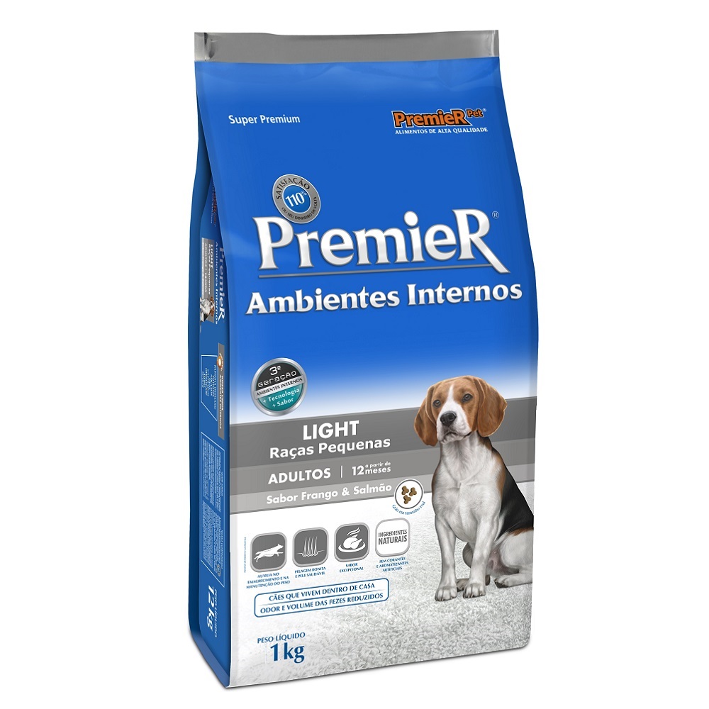 Cães Adultos que vivem dentro de casa, em contato próximo com seus donos, têm necessidades nutricionais especiais. PremieR Ambientes Internos Light Adultos é um alimento Super Premium destinado a estes cães, com o objetivo de mantê-los em forma, através da redução ou controle do peso. Sua fórmula exclusiva tem níveis reduzidos de gorduras e calorias, além de excelente sabor conferido pela inclusão de salmão. Para reduzir o volume e o odor das fezes, PremieR Ambientes Internos Light Adultos tem uma combinação exclusiva de fibras especiais e extrato de yucca.