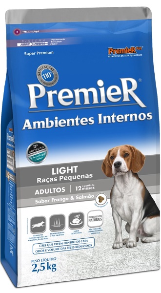 Cães Adultos que vivem dentro de casa, em contato próximo com seus donos, têm necessidades nutricionais especiais. PremieR Ambientes Internos Light Adultos é um alimento Super Premium destinado a estes cães, com o objetivo de mantê-los em forma, através da redução ou controle do peso. Sua fórmula exclusiva tem níveis reduzidos de gorduras e calorias, além de excelente sabor conferido pela inclusão de salmão. Para reduzir o volume e o odor das fezes, PremieR Ambientes Internos Light Adultos tem uma combinação exclusiva de fibras especiais e extrato de yucca.