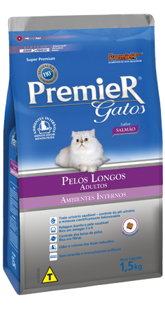 PremieR Gatos Adultos Pelos Longos Salmão oferece ao seu gato adulto de pelos longos um cuidado especial todos os dias. Através de uma combinação de ingredientes nobres, realça a beleza da pelagem, tornando-a exuberante e macia. No entanto, esses pelos densos podem predispor à formação das bolas de pelos, essas são resultado do acúmulo de pelos no trato digestivo pelo hábito de se lamber dos felinos. PremieR Gatos Adultos Pelos Longos Salmão traz em sua fórmula fibras selecionadas como a aveia e polpa de beterraba que previnem a formação dessas indesejáveis bolas de pelos.
