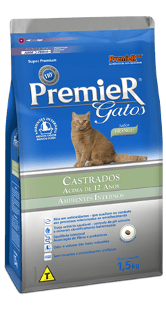 PremieR Gatos Castrados acima de 12 anos Frango é um alimento Super Premium que faz parte da linha PremieR Gatos Castrados, uma linha de alimentos especialmente desenvolvida para garantir o máximo em saúde e vitalidade aos gatos através de cuidados nutricionais específicos pós castração. Com foco em promover a manutenção do peso ideal e a saúde do trato urinário nos gatos castrados, estes alimentos apresentam-se divididos por faixa etária, já que tanto o peso quanto a incidência dos cálculos urinários varia em função da idade. Esta forma de apresentação garante alta precisão nos benefícios oferecidos e permite agregar cuidados gerais inerentes a cada fase da vida. Além disso, a combinação de ingredientes especiais com o alto aproveitamento dos nutrientes reduz o odor e volume das fezes minimizando possíveis inconvenientes de uma vida dentro de casa, facilitando o convívio entre o dono e seu gato.