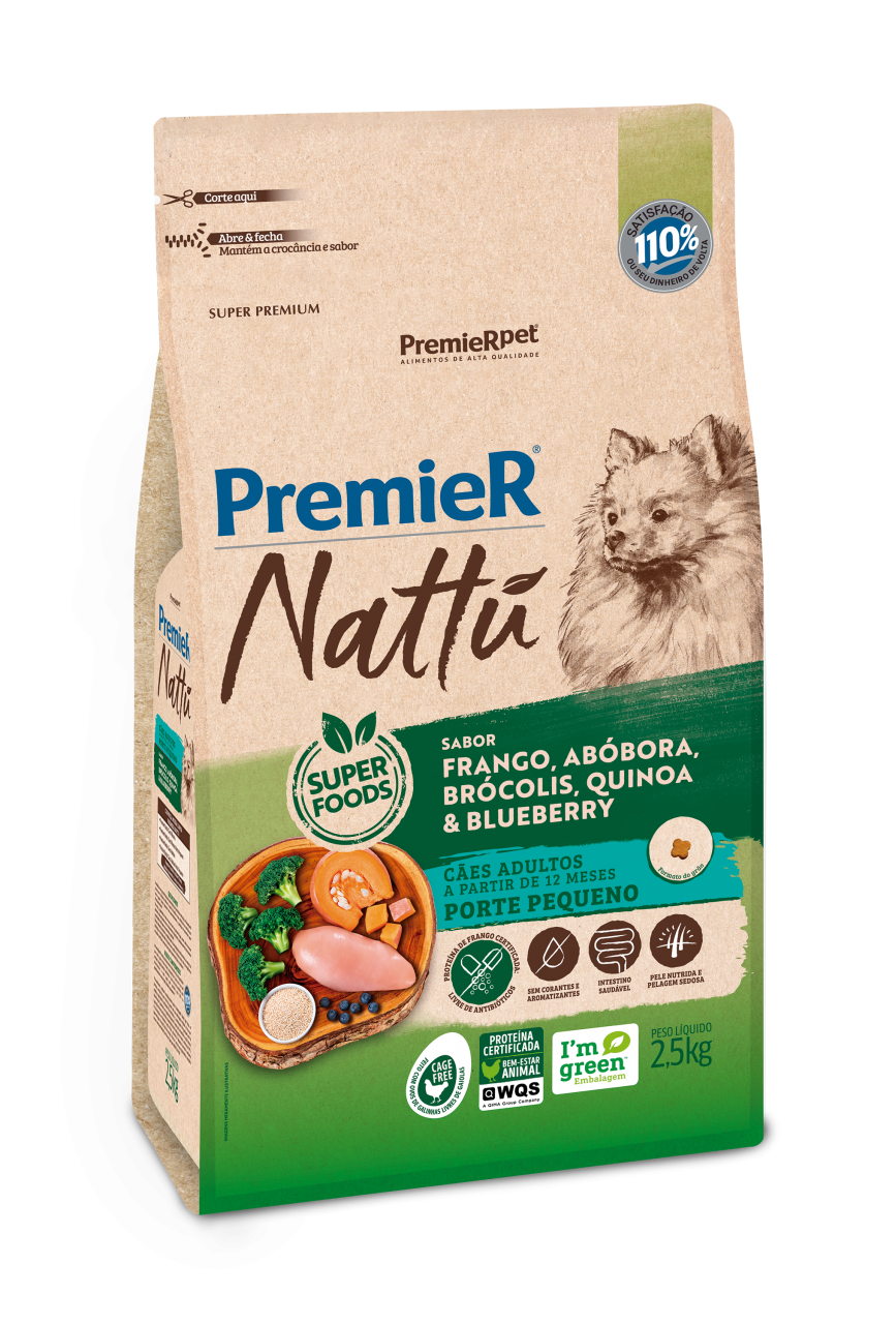 PREMIER NATTÚ ADULTO RAÇAS PEQUENAS SABOR FRANGO, ABÓBORA, BRÓCOLIS, QUINOA E BLUEBERRY 2,5 KG