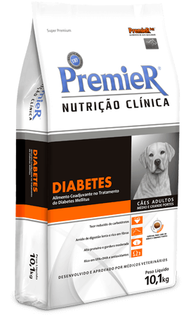 PremieR Nutrição Clínica Cães Diabetes é um alimento auxiliar ao tratamento da diabetes mellitus em cães adultos de médio ou grande porte. Além do tratamento prescrito pelo médico veterinário, algumas alterações na alimentação podem ser benéficas para pacientes com diabetes. Os objetivos da dieta são: colaborar para o controle da glicemia, auxiliar na manutenção da massa magra e do peso corporal ideal e modular os processos inflamatórios, minimizando-os. Para diabetes mellitus, este alimento deve ser utilizado sob orientação de um profissional, como único alimento por toda a vida do animal.