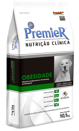 PremieR Nutrição Clínica Cães Obesidade é um alimento auxiliar ao tratamento da obesidade em cães adultos de médio ou grande porte. Além do tratamento prescrito pelo médico veterinário, a alteração na alimentação é fator primordial para o tratamento da obesidade. Os objetivos da dieta são: promover perda de peso efetiva e saudável, com manutenção da massa magra e suporte articular. Para obesidade, este alimento deve ser utilizado sob orientação de um profissional, até que o animal atinja o peso ideal.