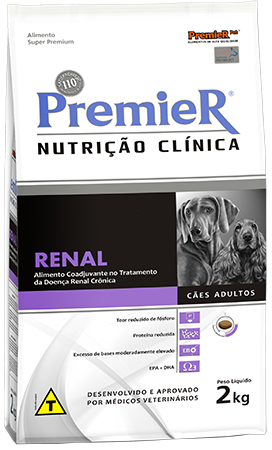 PremieR Nutrição Clínica Cães Renal é um alimento auxiliar ao tratamento da doença renal crônica e na diminuição da incidência de cálculos renais de oxalato de cálcio em pacientes nefropatas. Além do tratamento prescrito pelo médico veterinário, algumas alterações na alimentação podem ser benéficas para pacientes com doença renal crônica. Os objetivos da dieta são: minimizar os sintomas decorrentes da retenção de substâncias tóxicas e perda de elementos importantes na urina, diminuir a progressão da doença, proteger o tecido renal que ainda permanece saudável, prevenir a formação de cálculos urinários de oxalato de cálcio. Para doença renal crônica, este alimento deve ser utilizado sob orientação de um profissional como único alimento por toda a vida do animal.