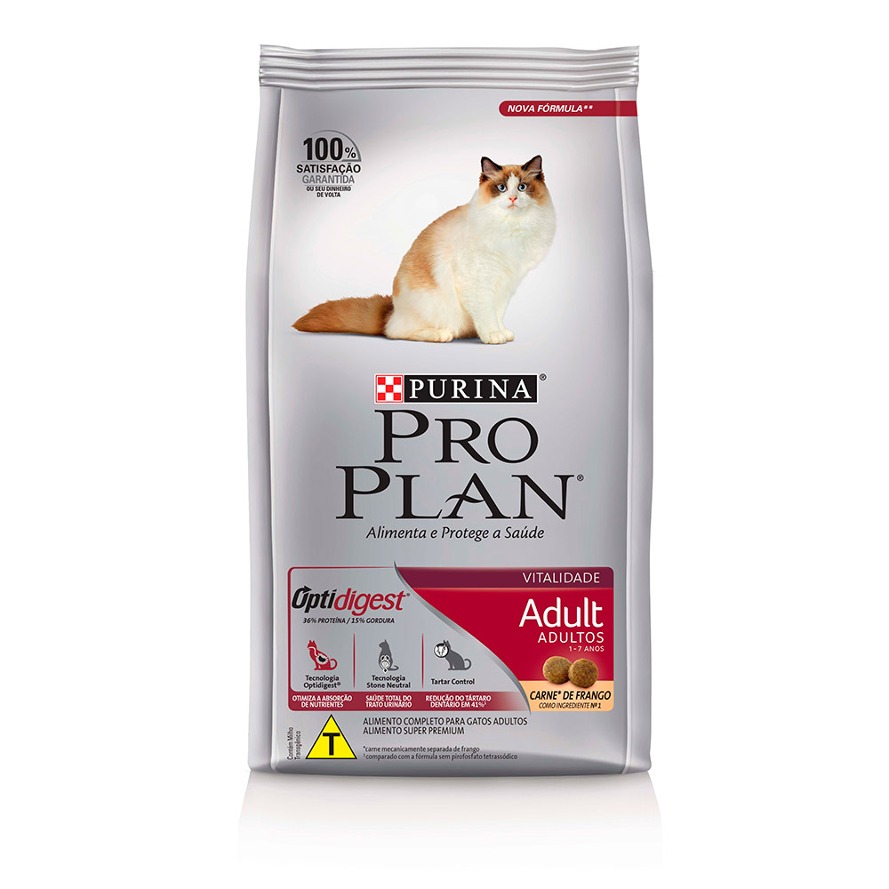 carne mecanicamente separada de frango (23%), quirera de arroz, farelo de glúten de milho*, farinha de subprodutos de frango, milho integral moído*, gordura animal estabilizada com tocoferóis (fonte de vitamina E), farinha de peixe, levedura seca de cervejaria, óleo de peixe, ovo em pó, cloreto de sódio (sal comum), fosfato bicálcico, cloreto de potássio, pirofosfato tetrassódico (0,5%), inulina, hidrolisado de fígado de ave e suíno, L-lisina, DL-metionina, taurina, vitaminas (A, D3, E, K3, B12, ácido ascórbico, mononitrato de tiamina, suplemento de riboflavina, cloridrato de piridoxina, niacina, biotina, ácido fólico, pantotenato de cálcio, cloreto de colina), minerais (sulfato de zinco, proteinato de zinco, sulfato ferroso, sulfato de cobre, proteinato de cobre, sulfato de manganês, proteinato de manganês, iodato de cálcio, selenito de sódio), antioxidante BHT. *Ingredientes transgênicos. Espécies doadoras do gene: Agrobacterium tumefaciens, Bacillus thuringiensis, Streptomyces viridochromogenes e Zea mays. **Inclusão de minerais quelatados (proteinato de zinco, proteinato de cobre e proteinato de manganês).