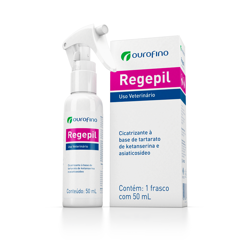 -Cicatrizante Regepil é composto pela exclusiva associação de tartarato de ketanserina e asiaticosídeo, indicado para estimular a cicatrização de feridas em cães e gatos, promovendo uma cicatrização mais rápida e de melhor qualidade.