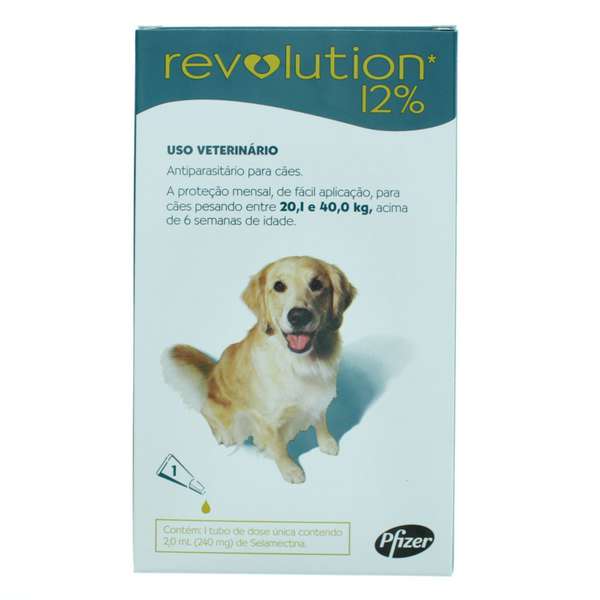 O Antipulgas e Carrapatos Pfizer Revolution 12% para Cães de 20 a 40 kg é composto pela selamectina, uma solução pronta para uso para o tratamento tópico de cachorros.