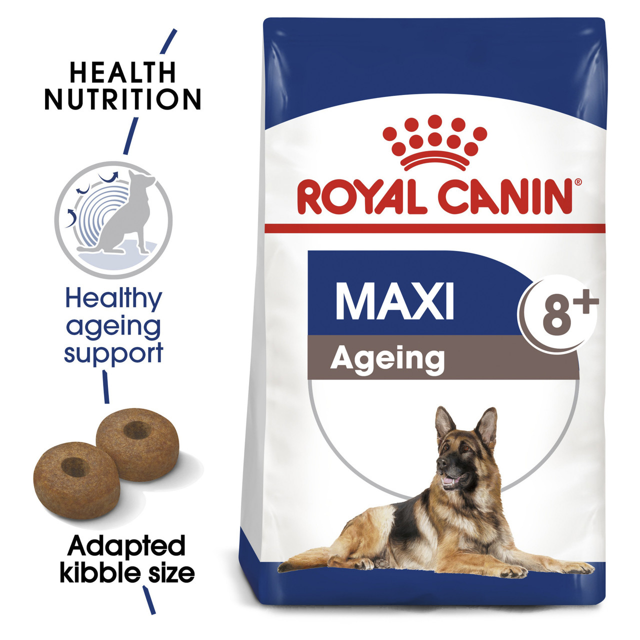A Ração Royal Canin Maxi Ageing 8+ para Cães Adultos de Raças Grandes Idosos com 8 Anos ou mais, da suporte a um envelhecimento saudável