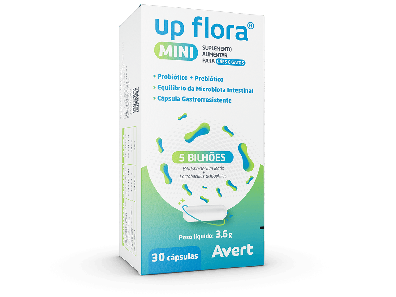 Up Flora é um suplemento alimentar composto por probiótico, prebiótico e zinco aminoácido quelato. Indicado para auxiliar no equilíbrio da microbiota intestinal de cães e gatos em suas diversas fases de desenvolvimento.