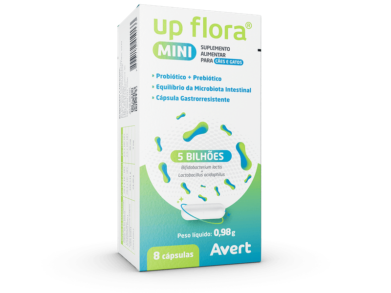 Up Flora é um suplemento alimentar composto por probiótico, prebiótico e zinco aminoácido quelato. Indicado para auxiliar no equilíbrio da microbiota intestinal de cães e gatos em suas diversas fases de desenvolvimento.
