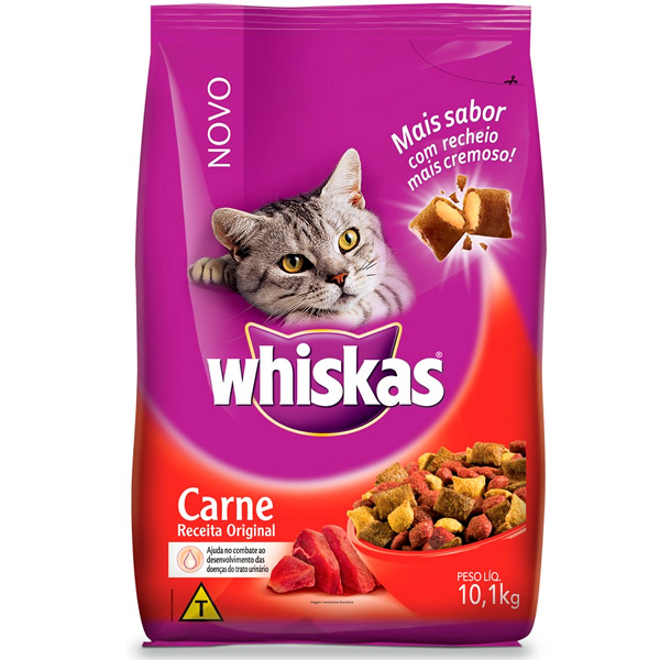 Ração Whiskas Carne para Gatos Adultos é mais saborosa com recheio muito mais cremoso e ainda ajuda no combate ao desenvolvimento das doenças do trato urinário.